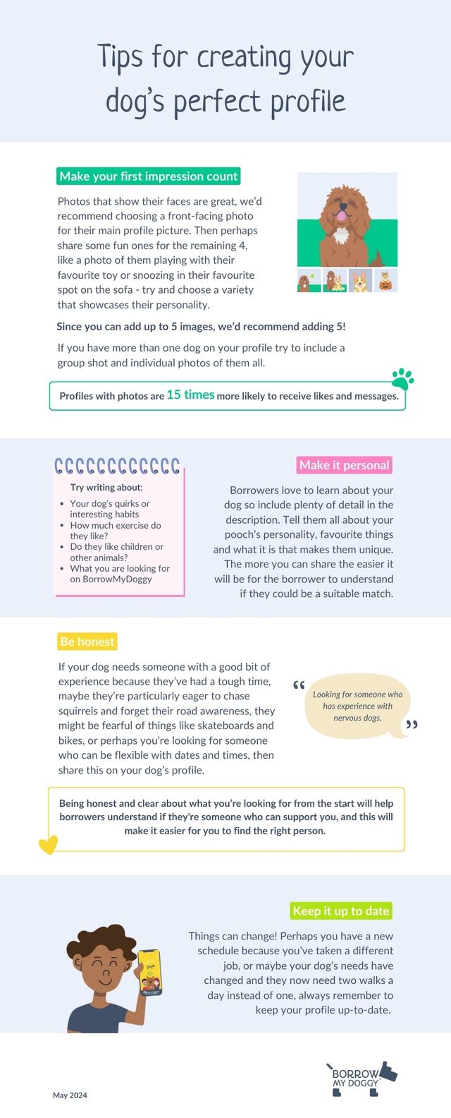 The first thing borrowers see when looking for a dog to borrow is your dog’s profile, so it’s very important to give them as much information as possible to help them decide if your pooch is a suitable match.