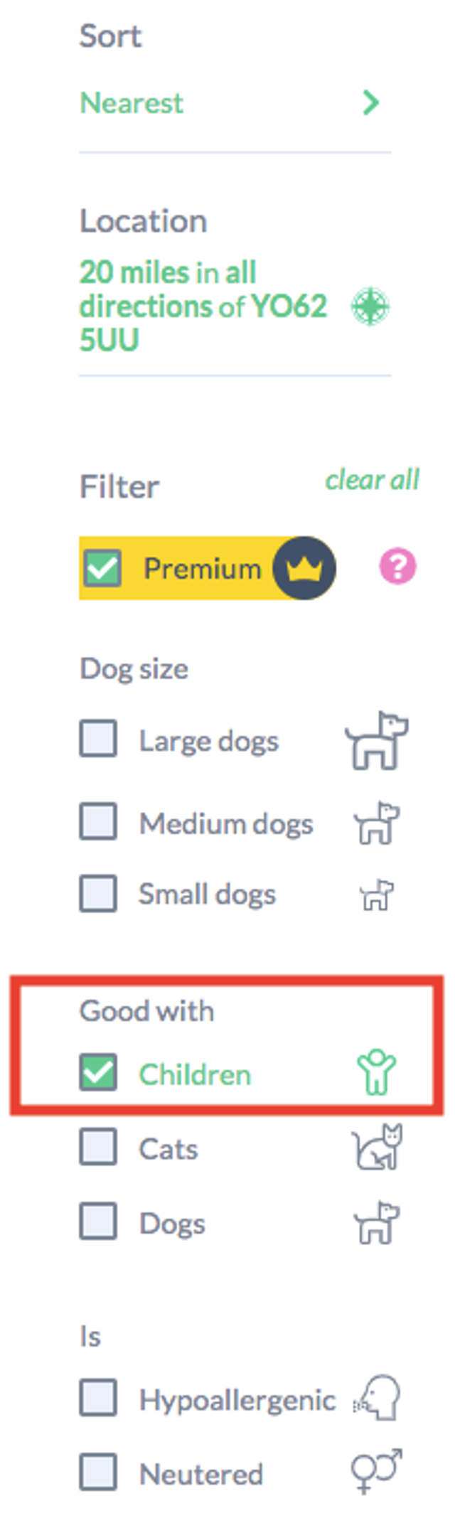 When looking for a dog you can use the filters on the left hand side of the Find a dog page to only show dogs "Good with children".