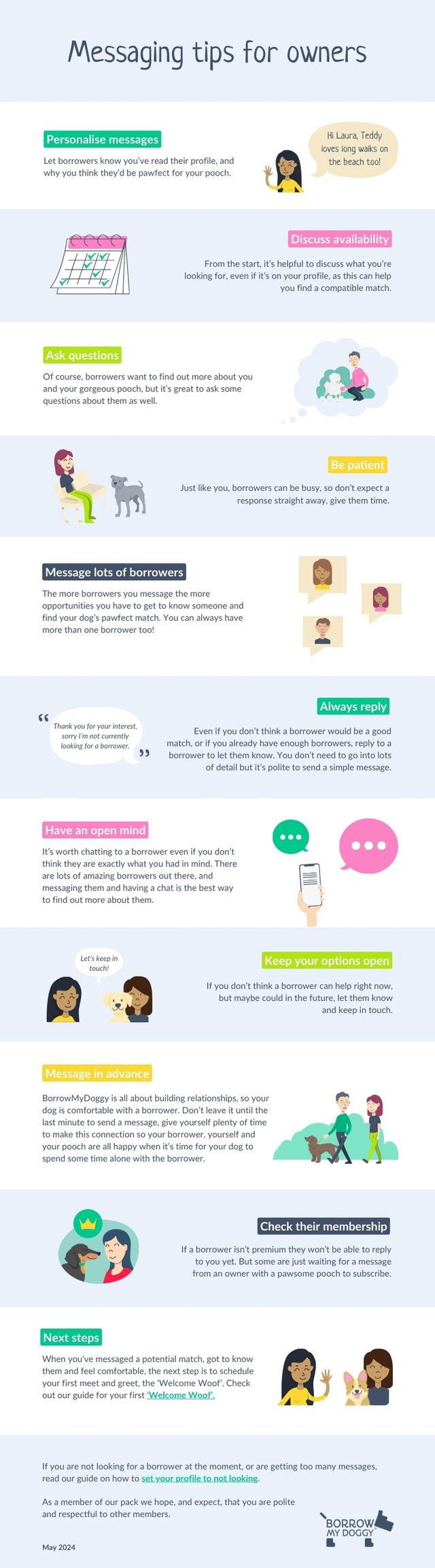 The more borrowers you message the more opportunities you have to get to know someone and find your dog’s pawfect match. You can always have more than one borrower too!
