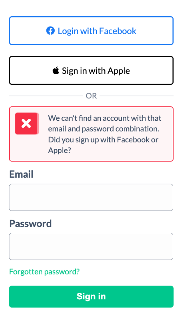 Are you seeing this error message? Chances are you have previously connected your BorrowMyDoggy account with Facebook or Apple.