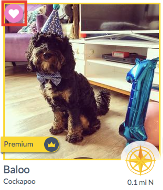 Once you've made a search, you'll see a small heart button in the top left corner of each individual dog. To like the dog, simply click the little heart symbol. The symbol will then turn pink as a sign that the dog has been added to your likes.