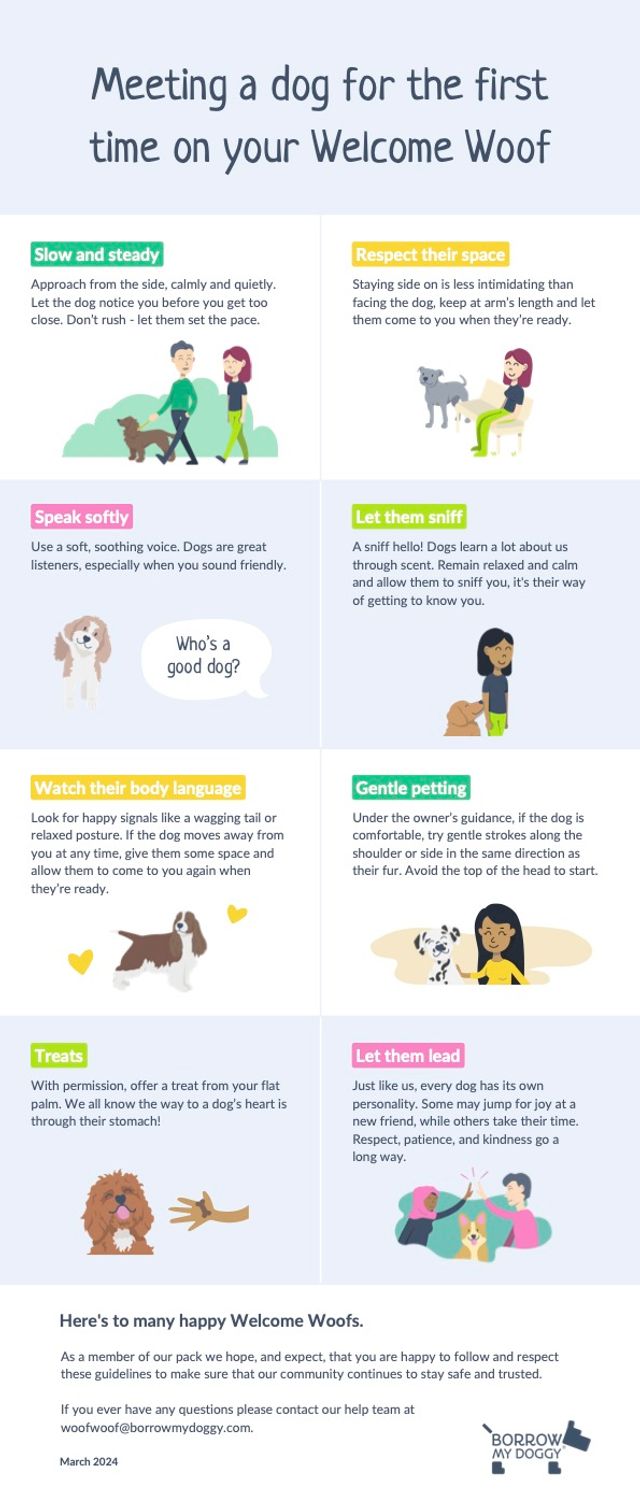 A ‘Welcome Woof’ is a great time to discuss your expectations and boundaries for what you both want from being a member of the BorrowMyDoggy community.
