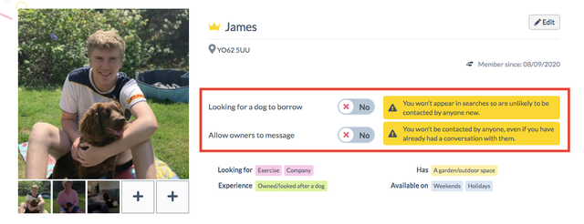 - To the right of your profile photo, you'll see Looking for a dog to borrow / Looking for a borrower with a button that you can slide to 'No'