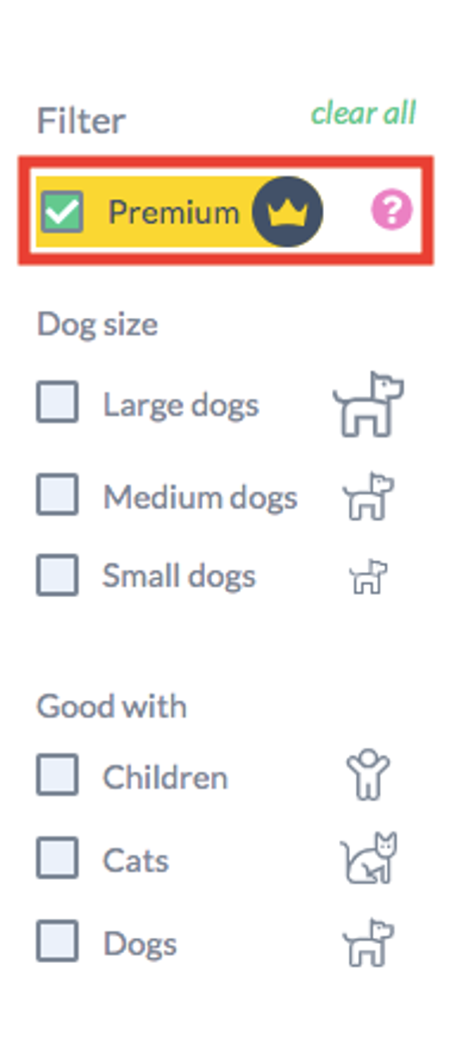 To search for premium doggies remember to tick the box at the top of the Filters section on the left side of the page titled Premium.